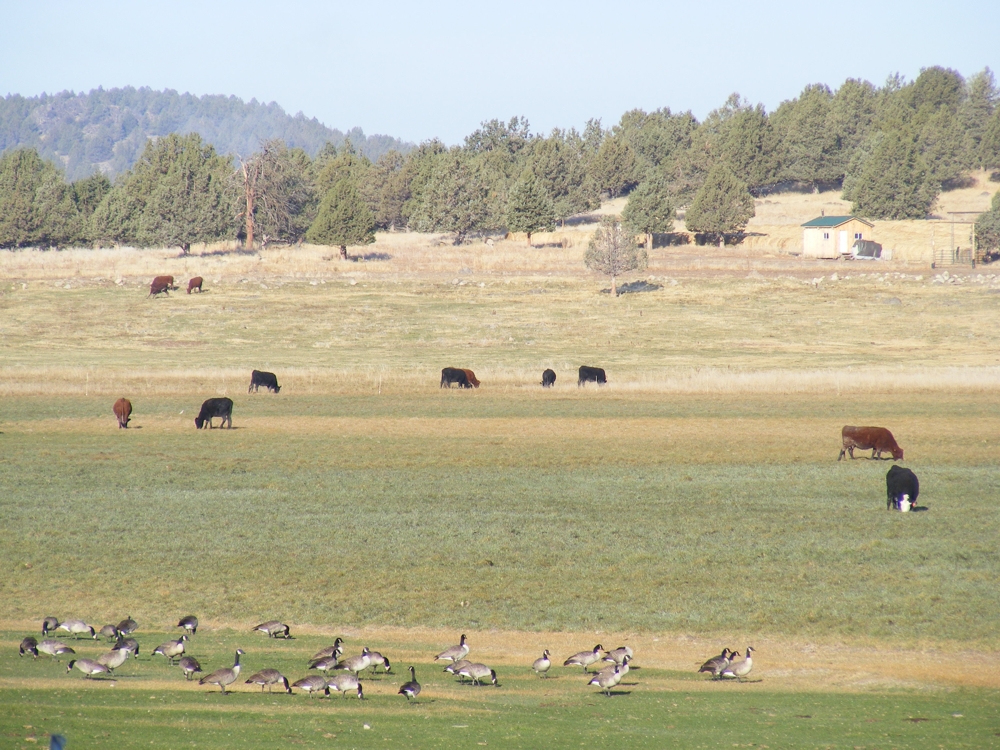 Geese and cows grazing